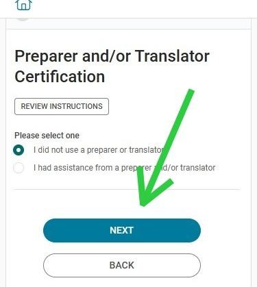 Select whether or not you used a preparer to help you fill out the form and click "Next"